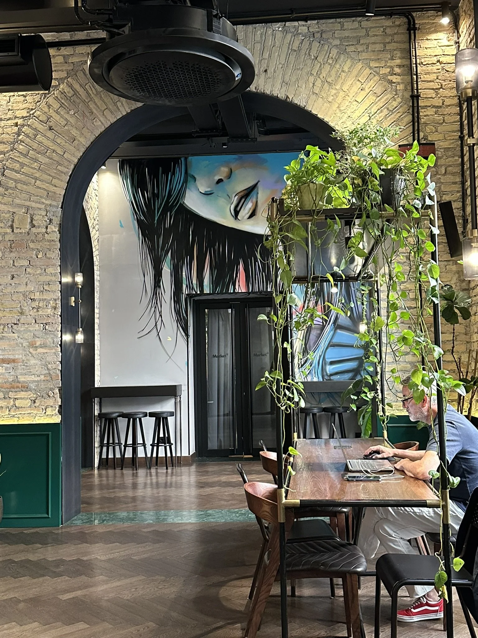 “Rough, centuries-old bricks frame sleek steel beams; velvet sofas pop against raw-cement walls; flashes of neon graffiti flirt with polished brass fixtures”